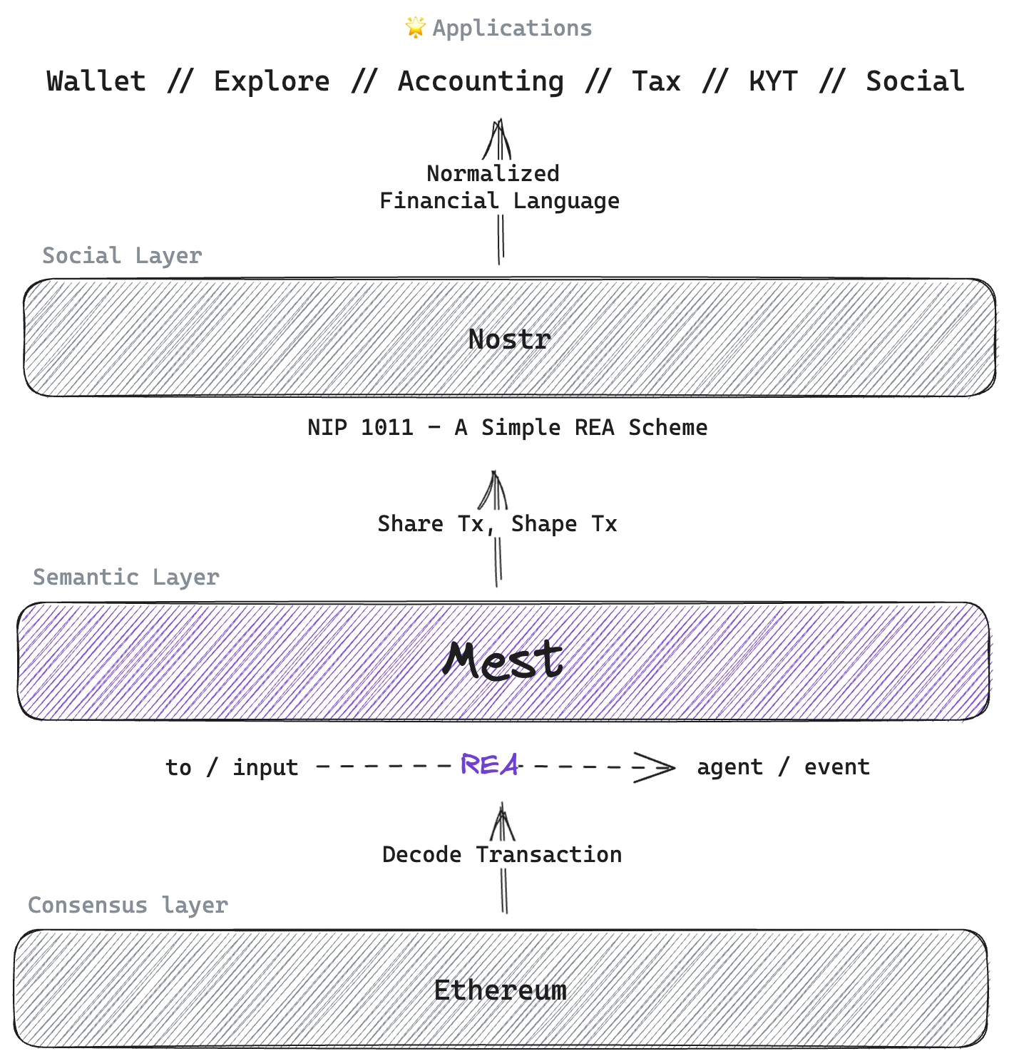 Mest is fundamentally based on two core technologies: Ethereum and Nostr. Anyone can parse and label transactions because one can freely obtain transaction data from Ethereum Nodes and send label data to Nostr Relays. Mest is primarily concerned with one thing: how to map raw transaction data to a standardized financial language, essentially mapping the to